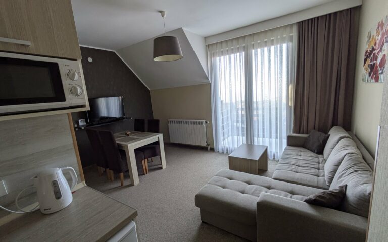 Soba je opremljena king size bračnim ležajem, krevetom na razvlačenje, garderoberom, radnim stolom i Smart TV uređajem sa kablovskim kanalima.